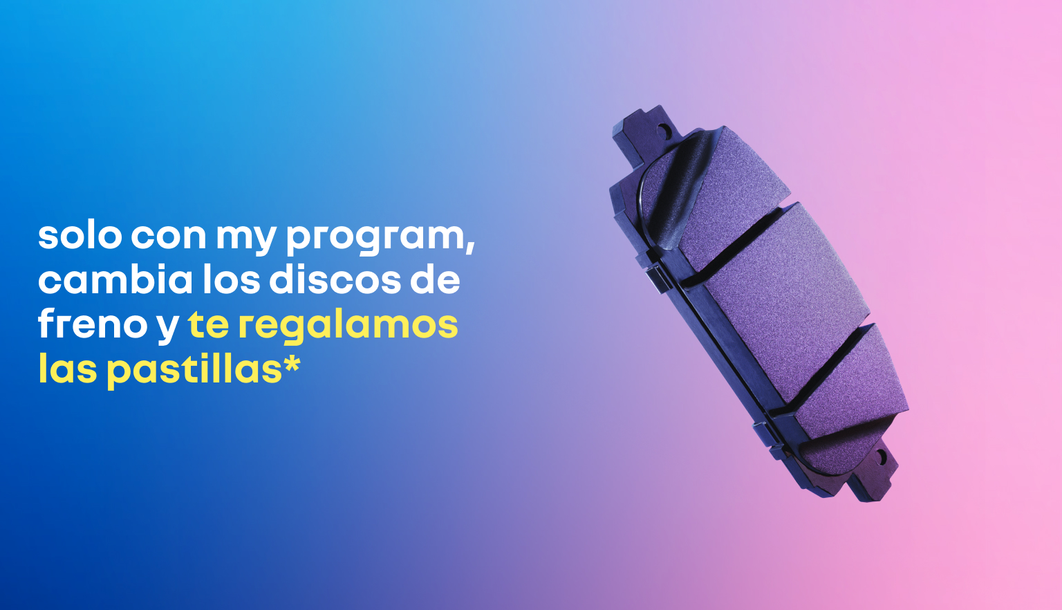 *Promoción válida del 1 de enero al 30 de junio de 2026 para particulares y autónomos que formen parte de my program. No compatible con otras promociones. Descuento ya incluido en factura, aplicable a precio sin impuestos. Regalo pastillas de freno (familia 803U) sujeto a disponibilidad de stock. El descuento no aplica a precio de mano de obra o a cualquier otro coste reflejado en factura.